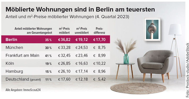 Berlin ist ein Hotspot für den Markt möblierter Wohnungen. Immer mehr Wohnungen werden komplett eingerichtet auf den Markt geworfen und dadurch immer teurer angeboten. Es besteht dringender Handlungsbedarf, denn oft wird dabei auch die Mietpreisbremse ausgehebelt.