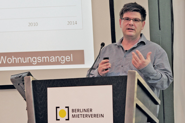 „Berlin ist auf dem Weg in die Wohnungsnot“, so das Resümee von Dr. Andrej Holm, Mitarbeiter am Institut für Sozialwissenschaften der HU Berlin, der vor 119 Delegierten der Jahreshauptversammlung des Berliner Mietervereins (BMV) über seine Untersuchungen zum Wohnungsmarkt referierte.