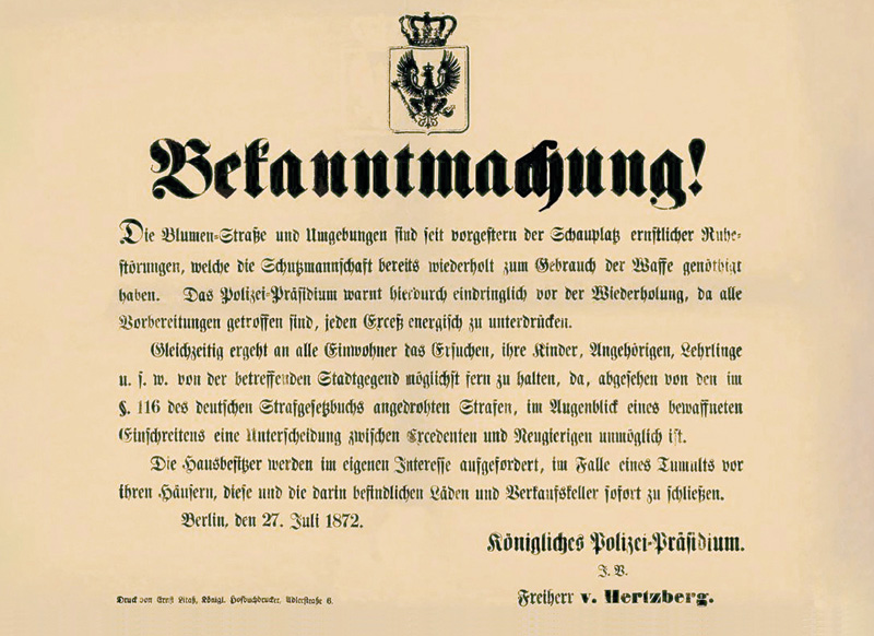 Im Juli 1872 brach sich in Berlin der große Unmut über die katastrophalen Wohnverhältnisse Bahn. Die Zwangsräumung einer Wohnung in der Blumenstraße hatte in der Nachbarschaft spontane Proteste hervorgerufen. Gleichzeitig regte sich Widerstand gegen den angeordneten Abbruch von Barackensiedlungen vor den Toren der Stadt. Die folgenden Straßenschlachten konnten Polizei und Militär erst nach drei Tagen gewaltsam beenden. Beteiligte wurden anschließend zu drakonischen Strafen verurteilt. Die Blumenstraßenkrawalle, die sich nun zum 150sten Mal jähren, waren der erste Mieterprotest, der im neu gegründeten Kaiserreich für Aufsehen sorgte. Doch bis der Staat begriff, dass er etwas zur Lösung der Wohnungsnot tun musste, vergingen noch Jahrzehnte.