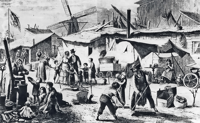 „Der beste Beweis dafür, was die Arbeiter vom preußischen Staat zu erwarten haben, liegt in der Verwendung der französischen Milliarden“, schrieb der sozialistische Vordenker Friedrich Engels 1872 in seiner Artikelserie „Zur Wohnungsfrage“. „Ist auch nur ein Taler dieser Milliarden verwandt worden, um die auf die Straße geworfenen Berliner Arbeiterfamilien unter Dach zu bringen? Im Gegenteil. Als der Herbst herangekommen, ließ der Staat selbst die paar elenden Baracken einreißen, die ihnen im Sommer als Notdach gedient hatten.“ Engels war sicher, „daß schon jetzt in den großen Städten hinreichend Wohngebäude vorhanden sind, um bei rationeller Benutzung derselben jeder wirklichen ‚Wohnungsnot‘ sofort abzuhelfen. Dies kann natürlich nur durch Expropriation [Enteignung] der heutigen Besitzer, resp. durch Bequartierung ihrer Häuser mit obdachlosen oder in ihren bisherigen Wohnungen übermäßig zusammengedrängten Arbeitern geschehen.“