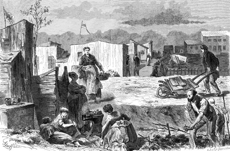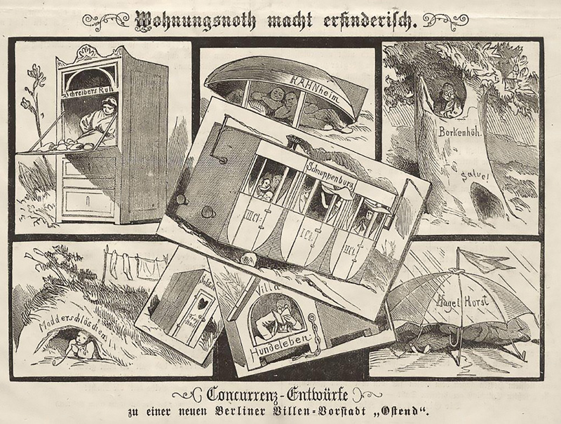 Vor den Toren der Stadt schritten Wohnungslose zur Eigeninitiative, wie die sozialdemokratische Zeitung „Der Volksstaat“ berichtet: „Auf freiem Felde, zwischen dem Cottbuserthor und der Hasenhaide, erheben sich mitten im Kartoffel- und Ackerland eine große Zahl ärmlicher, dürftig zusammengeschlagener Bretterbuden, durch deren Dach der Regen und durch deren fingerbreite Spalten in den Wänden der Wind pfeift. Und diese ärmlichen, erbärmlichen Buden, direkt auf der feuchten Erde aufgepflanzt, dienen einer großen Zahl von Einwohnern der kaiserlichen Residenz als Wohnstätten.“