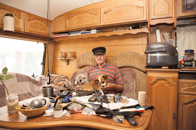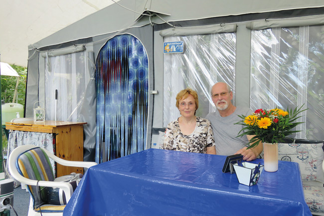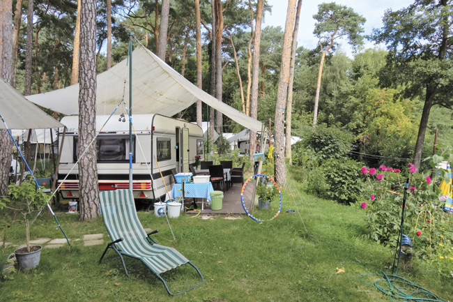 Bei Familie Schröder war es der „Betonkoller“, der sie vor über 30 Jahren zu überzeugten Campern machte. „Ich bin in der Uckermark aufgewachsen – als wir nach Marzahn gezogen sind, war da kein Baum und kein Strauch“, erzählt Sigrid Schröder. Die Familie legte sich ein Segelboot zu, und kurze Zeit später pachteten sie einen Dauercampingplatz. Obwohl es erst ihre zweite Saison im Wohnwagen ist – vorher hatten sie ein Zelt –, ist das Wohnmobil samt Vorplatz liebevoll dekoriert und mit jeder Menge Finessen ausgestattet, inklusive Lichtanlage und richtiger Klingel – alles funkgesteuert, wie Norbert Schröder stolz erklärt. Sogar eine Klimaanlage für heiße Nächte hat er eingebaut. Der gelernte Koch ist handwerklich geschickt und würde am liebsten den ganzen Tag bosseln und tüfteln. Das Rentnerehepaar ist von Donnerstag bis Sonntag auf dem Platz. Sie haben kein Auto, die Fahrt in ihre Marzahner Wohnung dauert fast zwei Stunden. Dort werden dann Arztbesuche erledigt und Wäsche gewaschen.