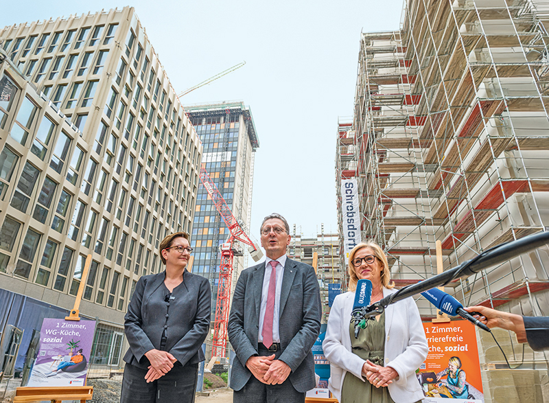 Sozialwohnungen werden ganz überwiegend von öffentlichen Wohnungsunternehmen errichtet. So auch auf der Baustelle, wo die Ministerin zusammen mit Berlins Bausenator Christian Gaebler (SPD) ihre Kampagne vorstellte: Hinter dem ehemaligen Postscheckamt am Halleschen Ufer baut die landeseigene Degewo 337 Wohnungen, davon sind 75 Prozent gefördert. „Dass man für 6,50 Euro auch in Kreuzberg wohnen kann, macht die soziale Stadtentwicklung aus“, sagt Christian Gaebler, der hofft, dass in diesem Jahr in Berlin erstmals die Förderung von 5000 neuen Sozialwohnungen bewilligt werden kann. Ob die Werbekampagne dabei hilft?