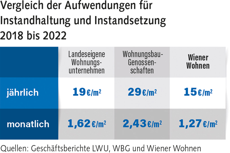 Interessant sind auch die festgestellten Unterschiede bei den Kosten der Bewirtschaftung. Sie betragen bei den LWU insgesamt 9,14 Euro pro Quadratmeter (darunter 0,99 Euro Personalkosten), bei den Genossenschaften 8,67 Euro (1,10 Euro für Personal) und bei der Wiener Wohnen nur 7,01 Euro (1,52 Euro für Personal) „Bei den anderen gemeinwohlorientierten Unternehmen werden die Bestände besser instandgehalten und das Personal besser bezahlt – und trotzdem sind die Mieten günstiger“, so Hamann-Onnertz (siehe hierzu auch unsere Tabelle).