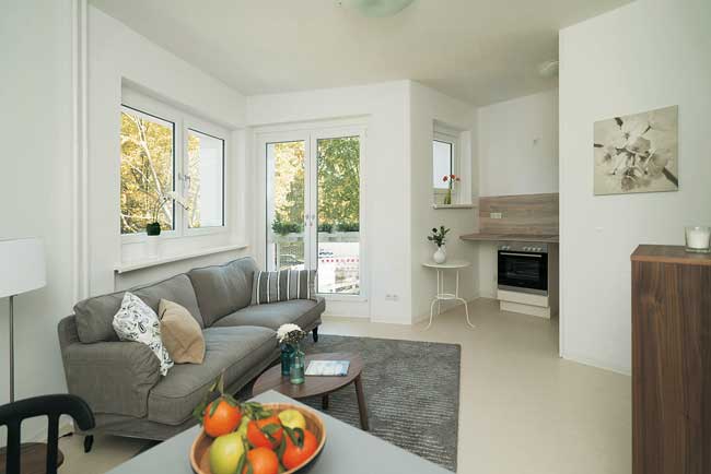 Die Einraumwohnungen sind allerdings nur rund 27 Quadratmeter groß, inklusive Flur, Bad, Einbauküche und Schlafnische. 380 bis 400 Euro wird die Warmmiete betragen. Das ist nicht wenig, aber die Gewobag argumentiert, dass dieser Betrag auch die Nutzung der Serviceleistungen und der Gemeinschaftseinrichtungen beinhaltet. Immerhin: 10 Prozent der Gesamtfläche sind Gemeinschaftsflächen.