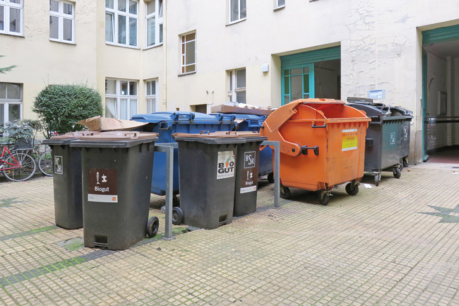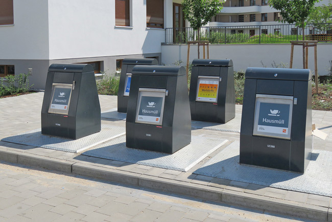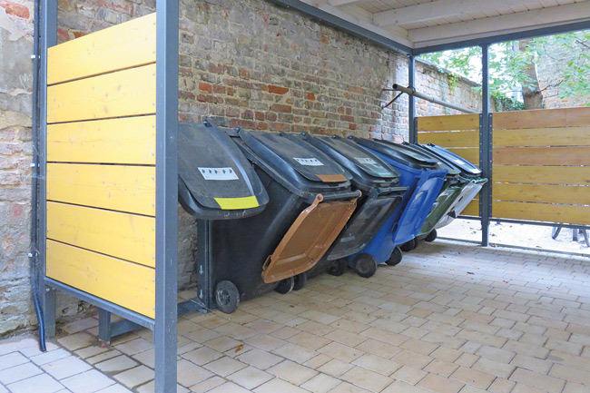 Im Prinzip hat sich auf den Höfen der Mietwohngebäude in den letzten Jahrzehnten nichts verändert. Die Teppichklopfstangen sind zwar verschwunden, aber die Müllsammelbehälter sind geblieben. Geblieben ist auch viel zu oft die Unansehnlichkeit der Behälter und der Standplätze: Tonne neben Tonne, manchmal überdacht, manchmal umzäunt, aber meistens kein Hingucker. Kaum ein Platz, der seiner Bedeutung als Rohstoffsammelstelle gerecht wird.