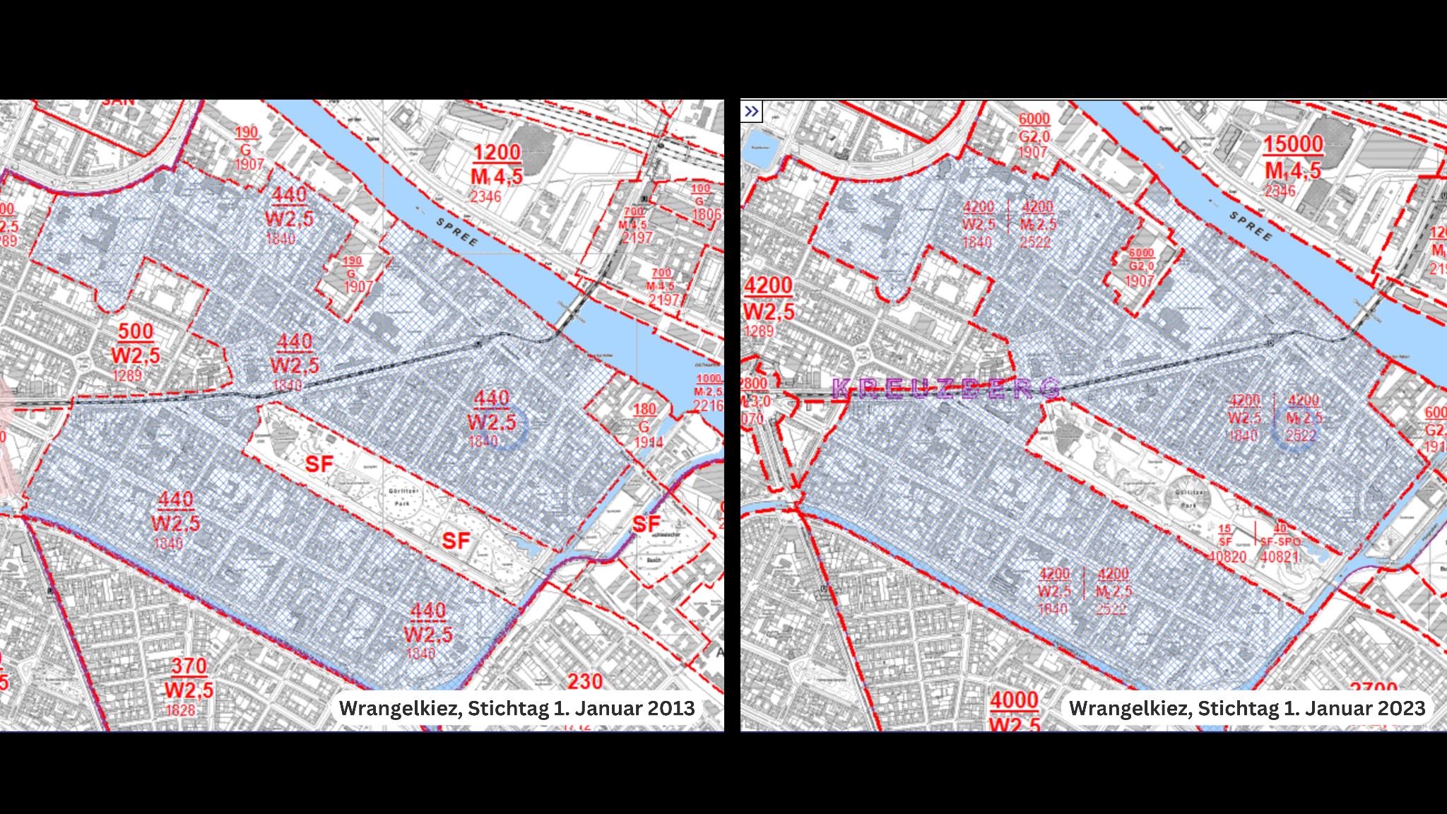 Ein Blick in den Bodenrichtwerteatlas (BORIS) zeigt, wie sich der Bodenmarkt in den vergangenen zehn Jahren aufgeheizt hat. Ein Beispiel: Lag der Bodenrichtwert für den Wrangelkiez in Kreuzberg Anfang 2013 noch bei 440 Euro pro Quadratmeter, betrug er zehn Jahre später 4.200 Euro pro Quadratmeter. Auch wenn der Preisanstieg in den begehrten Innenstadtbezirken besonders eklatant ist, betrifft er das gesamte Stadtgebiet. Selbst in der Hochhaussiedlung Heerstraße in Spandau am äußersten Rand von Berlin haben sich die Bodenpreise innerhalb von zehn Jahren verdreifacht.