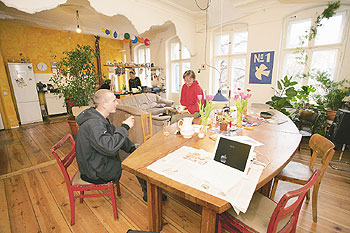 1980 stand das Wohnhaus leer und wurde besetzt, 1983 durch Mietverträge legalisiert. „2002 bot die Bewoge uns das Haus zum Kauf an“, berichtet Christoph. Der „unterbeschäftigte“ Freiberufler engagierte sich in der Selbstverwaltung und verhandelte mit den Banken. Und weil die 35 langjährigen Mieter keine privaten Eigentümer werden wollten, prüften sie andere Finanzierungsmodelle. „Wir haben uns gegen eine Genossenschaft entschieden. Weil die Verwaltungsarbeit mit bezahlt werden muss, ist sie zu teuer.“ Aus ihrem linksalternativen Verständnis heraus sollte das Modell garantieren, dass die Bewohner über Umbauten und Investitionen ebenso wie über neue Mitbewohner entscheiden können, dass die Hausverwaltung in ihren Händen bleibt und sie die Miethöhen festlegen können – eben selbstorganisiert. Und weil ihnen außerdem wichtig war, das Haus dem Markt der Grundstücks- und Immobilienspekulation zu entziehen, entschieden sie sich für ein Zusammengehen mit dem „Mietshäuser Syndikat“. Das hat die gleichen Ziele ganz groß auf seine Fahnen geschrieben. Inzwischen besitzt der Hausverein – alle Bewohner sind Mitglieder – gemeinsam mit dem Mietshäuser Syndikat das Haus. Dazu wurde eine GmbH gegründet, die den Eigentumstitel hält. Die einzigen gleichgewichtigen Gesellschafter: Hausverein und Mietshäuser Syndikat. So gehört den Bewohnern das Haus – und sie sind weiterhin Mieter.