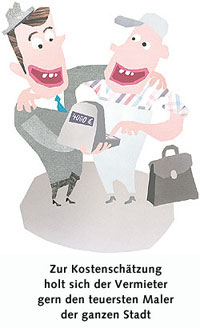 Wurde weder vom Mieter (aus Unkenntnis) noch vom Vermieter (der sehr wohl wusste, was er tat) ein Abnahmeprotokoll unterschrieben noch der Zustand der Wohnung im Beisein von Zeugen für ordnungsgemäß befunden, kann der Vermieter eine Malerfirma seines Vertrauens mit der Renovierung beauftragen. So kommen schnell Tausende von Euro an Kosten zusammen, ohne dass der ausgezogene Mieter darüber informiert wird. Das Honorar dieser Arbeiten verrechnet der Vermieter mit der Kaution, für deren Rückzahlung er sechs Monate Zeit hat. Darüber hinausgehende Beträge fordert er beim ehemaligen Mieter ein. Manche Vermieter versuchen auch die Demontage alter, von Vormietern durchgeführter Einbauten dem ausziehenden Mieter unterzujubeln. Aber man kann sich wehren: Der Vermieter ist beweispflichtig, dass der Mieter die Einbauten selbst vorgenommen hat.