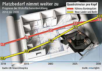 Nach einer aktuellen Prognose des Berliner Forschungsinstituts Empirica im Auftrag der Landesbausparkassen (LBS) steigt der Wohnflächenbedarf pro Person bis zum Jahr 2030 weiter – in den westlichen Bundesländern um 15 Prozent von zurzeit 47 auf dann 54 Quadratmeter, in den neuen Ländern und Berlin sogar um 25 Prozent von 43 auf 55 Quadratmeter.