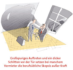 Einzeleigentümer verzichten dagegen schon mal auf die Verdienstbescheinigung, wenn der Wohnungsinteressent mit dem Porsche vorfährt und sich als Manager eines großen Konzerns vorstellt. Kriminelle Mietbetrüger verstehen es, durch ihr Äußeres zu blenden und treten häufig ausgesprochen höflich und souverän auf. Kleinere, unerfahrene Vermieter fallen darauf eher herein als eine professionelle Vermietungsabteilung.