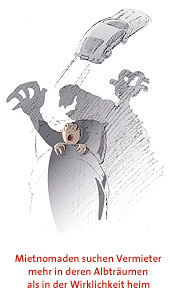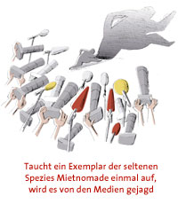 Die schwarz-gelbe Koalition hat angekündigt, eines der „drängendsten wohnungswirtschaftlichen und mietrechtlichen Probleme“ anzugehen. Guido Westerwelle und seine FDP meinen damit das „Mietnomadentum“, bestens bekannt aus dramatischen Reportagen in Privatsendern und Boulevardblättern. Im wirklichen Leben dagegen sind Mietnomaden „so selten wie der Satanspilz“, meint ausgerechnet der Herausgeber der Vermieterzeitschrift „Das Grundeigentum“. Doch die Hysterie wird immer wieder geschürt – zu Lasten der 99,9 Prozent vertragstreuen Mieter.