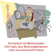 Sicherlich ist es nachvollziehbar, dass sich Vermieter absichern wollen, doch mittlerweile können Mieter, die sich verschuldet haben oder die all diese Papiere nicht vorlegen können, kaum noch eine Wohnung bekommen. Am Ende dieser Entwicklung steht der „gläserne Mieter“, von dem man weiß, ob er schon mal sein Konto überzogen oder eine Mietminderung geltend gemacht hat.