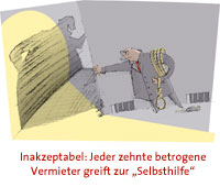 Ein weiteres Ergebnis, das aufhorchen lässt: Jedes zehnte Betrugsopfer greift zur Selbstjustiz, um einen Mietnomaden wieder loszuwerden. Vermieter räumen die Wohnung ohne Gerichtsbeschluss, indem sie das Schloss austauschen, Strom und Wasser abstellen oder dem zahlungsunwilligen Mieter drohen. Den vorgeschriebenen und einzig akzeptablen – wenn auch langwierigen – Rechtsweg mit außerordentlicher Kündigung und Räumungsklage beschreiten inzwischen nur noch 58 Prozent der Opfer.