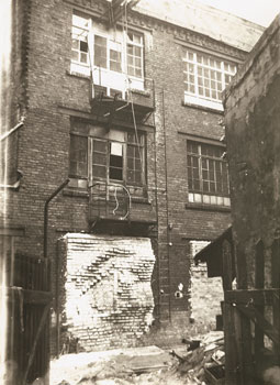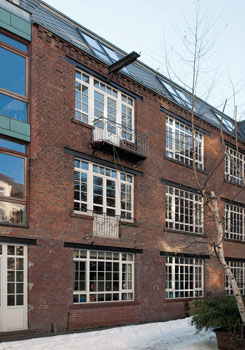 Durchquert man das Vorderhaus der Stephanstraße 60, erreicht man einen gepflegten, hellen Hinterhof mit ein paar Bäumen, Sträuchern und einer mit Grünzeug bewachsenen alten Mauer. An der gegenüberliegenden Seite steht ein dreistöckiges ehemaliges Fabrikgebäude. Es hat breite, bis zum Boden reichende Fenster.