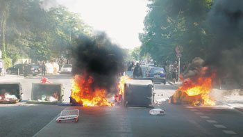 Polarisierte Grenzziehung: Hausbesetzerbarrikade im Herbst 2011 in Kreuzberg, Wohnen hinter Sicherheitszäunen „Am Friedrichshain“