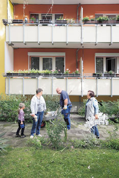 Die Genossenschaft unterstützt interne Umzüge unter sozialen Aspekten, bei der Vergabe frei gewordener Wohnungen werden Alleinerziehende und Ältere bevorzugt berücksichtigt. Neue Mieter sollen sich bei den anderen im Haus vorstellen. Die Genossenschaft teilt per Aushang Namen und Kontaktdaten der neuen Bewerber mit, bei Interesse können die vorhandenen Bewohner Kontakt mit den Bewerbern aufnehmen. Das Ja oder Nein fällt durch Mehrheitsentscheid. Übrigens: Die Genossenschaft zahlt sogar eine „Dividende“. Für Verbesserungen in den Häusern und im Wohnumfeld hat der Vorstand ein Sonderbudget eingerichtet, 2012 standen 13.000 Euro zur Verfügung. Gerade plant die Genossenschaft ihren ersten Neubau.