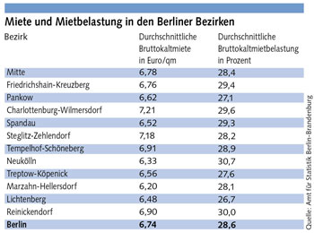 In Neukölln ist die Mietbelastung mit 30,7 Prozent am höchsten. Dies ist zwar der Bezirk mit der zweitniedrigsten Durchschnittsmiete, aber auch die Einkommen sind hier sehr niedrig. Die Lichtenberger Haushalte haben mit 26,7 Prozent die geringste Belastung. Die höchsten Bruttokaltmieten muss man in Charlottenburg-Wilmersdorf und Steglitz-Zehlendorf mit jeweils über 7 Euro zahlen.