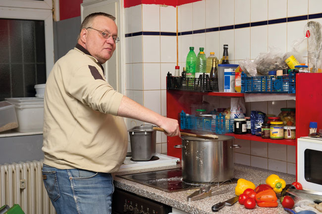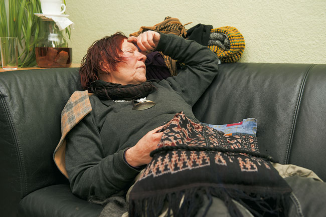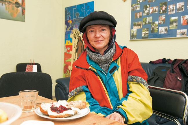 Für Ursula Czaika ist René einer ihrer Dauergäste. Genau wie Horst, der seinen Hut nie abnimmt, nur freundlich nickt, wenn andere erzählen. Woher kommt er? Wie alt ist er? Er spricht hastig, gehetzt. Um „politisch zu demonstrieren“, sei er 2005 nach Berlin gereist, murmelt er, dann wird seine Stimme leiser, die Worte verwischen, er ist nicht mehr zu verstehen. Genau wie der alte Mann, der vor der Tür zusammengesunken im Rollstuhl sitzt und sich unter einem Sims nur notdürftig vor dem Nieselregen schützen kann. Seinen Kaffee, belegte Brote und etwas Süßes bekommt er nach draußen gereicht. Ursula Czaika: „Das tut mir in der Seele weh, ich würde ihn gern hereinholen, aber hier drinnen rastet er immer wieder aus, wir mussten schon die Polizei holen.“