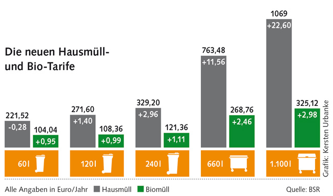 Sabine Thümler, Sprecherin der BSR, begründet die aus ihrer Sicht „moderaten Gebührenanpassungen“ mit den Tarifabschlüssen für den öffentlichen Dienst. Die BSR erfülle damit zugleich die Vorgaben des Ende 2015 unterzeichneten Unternehmensvertrages. Und überhaupt bleibe Berlin die günstigste Großstadt in Deutschland, was die Abfallgebühren betrifft – was für viele Berliner ein schwacher Trost ist, für die die Betriebskosten ein wichtiger Kostenfaktor sind.