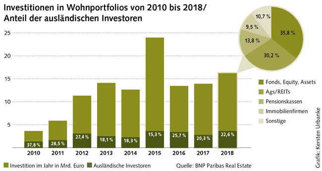 Bisher investierten Pensionsfonds und ähnliche Anleger wegen höherer Renditen bevorzugt in Gewerbeimmobilien. Doch ihr jetzt erstarkendes Interesse an Wohnimmobilien ist an aktuellen Zahlen ablesbar. Lag ihr Anteil an Wohnungsmarkt-Transaktionen 2014 bei rund 4 Prozent, so waren es 2018 knapp 14 Prozent, einer der höchsten Werte bis dato. Bei einem Marktvolumen von 16,3 Milliarden Euro sind das 2,3 Milliarden Euro. Weil Pensionskassen meist direkt kaufen, sind sie auch leicht identifizierbar verglichen mit Investoren, die über Mittler wie Immobilienfonds ihre Spuren verwischen. Insgesamt 22,6 Prozent der Käufer kamen zuletzt aus dem Ausland.