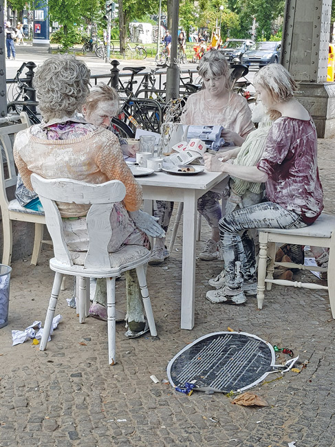 Reflektor Neukölln: Unser Ziel ist es, den Status quo der Gesellschaft, aber auch ihre Veränderungen zu reflektieren: Die Gesellschaft ist unserer Meinung nach durch Vereinzelung und Entfremdung gekennzeichnet. Nur gemeinsam können wir etwas bewirken. Im Kollektiv können wir widerständig und handlungsfähig sein. Unser wöchentliches Zusammenkommen begreifen wir schon als Gegenbewegung. Schön ist es dann, wenn Ergebnisse der Treffen sich in konkreten Aktionen manifestieren. Das „Mahl der Verdrängten“, unsere letzte Performance, zeigt eine Frühstücksszene: Mit wiederkehrenden Handlungen verdeutlicht sich die fast ausweglose Situation von Menschen kurz vor der Verdrängung.