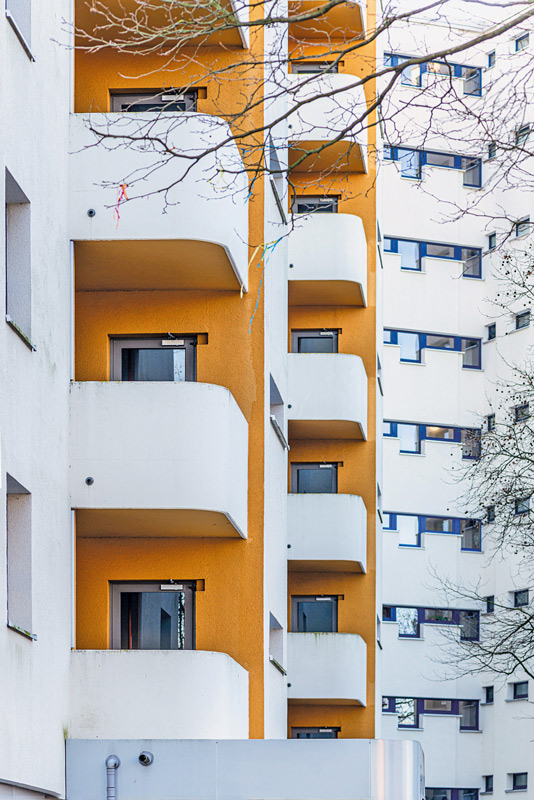 Aus Rücksicht auf die St. Lukas-Kirche in der Bernburger Straße sind die Häuser des „Frauenblocks“ auf vier Geschosse beschränkt und zurückhaltend gestaltet. Myra Warhaftigs gelbe Ziegelfassade hat unregelmäßig angeordnete Fenster, wirkt aber sonst schlicht – im Gegensatz zu Zaha Hadids Gebäude, das scharfkantig in die Ecke zur Stresemannstraße hineinragt und mit sieben Stockwerken die Häuser ihrer Kolleginnen übertrumpft.