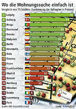 78 Prozent der Leipziger Bevölkerung stimmten der Aussage zu, dass es dort einfach ist, guten Wohnraum zu einem vernünftigen Preis zu finden: Platz 1. Mit Berlin, Dortmund (Platz 4) sowie Essen (Platz 11) befinden sich vier deutsche Städte auf den ersten elf Plätzen des Rankings.