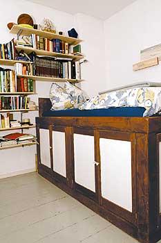 „In einem großen Zimmer gibt es nichts Praktischeres als eine Wand mit durchgehenden Regalen“, meint Judith Wilson , Autorin des Buches „Family Living“. Für kleine Räume eigne sich eine eingebaute Schrankwand, die nicht tiefer als 50 Zentimeter sein müsse und die, wenn sie ganz schlicht sei, kaum ins Auge falle. Judith Wilson: „Mit maßgenauen Einbauten lassen sich auch ungünstige Winkel bestens ausnutzen, etwa durch Bücherregale über der Tür.“ In kleinen Wohnungen und Durchgangsbereichen sollten Einbauten möglichst „unsichtbar“ sein, rät sie. Ideal seien ganz glatte Türen in der Farbe der Wände.