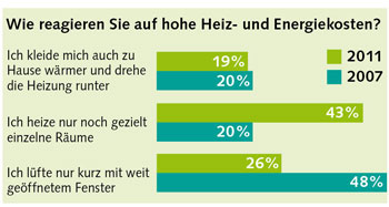 Das Internet-Immobilienportal „Immowelt“ ermittelte kürzlich, dass 60 Prozent der Deutschen mittlerweile beim Heizen sparen – und dabei unterschiedliche Strategien anwenden: Pullover anziehen, weniger lüften, einzelne Räume gar nicht mehr heizen (siehe Grafik). Nur 12 Prozent der rund 1000 Befragten haben angegeben, dass sie auf behagliche Wärme nicht verzichten wollen und lieber die hohen Kosten tragen.