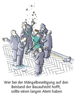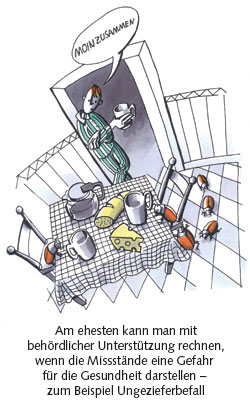 Grundsätzlich kann man bei gravierenden Mängeln auch die Bau- und Wohnungsaufsicht des Bezirks einschalten. Allzuviel sollte man sich aber davon nicht versprechen. Die Damen und Herren erscheinen zwar meist zur Ortsbegehung, zeigen sich aber ansonsten ausgesprochen träge. „Oft setzen sie dem Vermieter sehr lange Fristen zur Mängelbeseitigung, und nur selten treten sie in Ersatzvornahme“, berichtet der Leiter der BMV-Rechtsabteilung, Stefan Schetschorke. Eigentlich steht der Wohnungsaufsicht ein umfangreiches Instrumentarium zur Verfügung, um den Vermieter auf Trab zu bringen. Neben der Verhängung von Zwangsgeldern kann die Behörde auch in Vorleistung treten, beispielsweise Heizöl bestellen oder Feuchtigkeitsschäden beseitigen. Das ausgelegte Geld kann sie sich dann vom Eigentümer zurückholen. Doch in der Praxis kommt das nur selten vor. Am ehesten wird bei gesundheitsgefährdenden Missständen durchgegriffen, etwa Ungezieferbefall oder auch bei extremen baulichen Schäden, etwa einem absturzgefährdeten Balkon. Viele betroffene Mieter haben daher den Eindruck, dass die Mitarbeiter der Bau- und Wohnungsaufsicht grundsätzlich aufseiten des Vermieters stehen. Doch es schadet nicht, sich bei der Wohnungsaufsicht Unterstützung zu holen – zusätzlich zum mietrechtlichen Vorgehen.