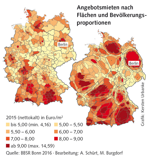 Wenn man Sozialdaten wie das Mietniveau in üblichen Landkarten darstellt, gibt das oft ein verzerrtes Bild. Das Bundesinstitut für Bau-, Stadt- und Raumforschung (BBSR) hat eine alternative Kartografie vorgestellt, die das Ausmaß des hohen Mietniveaus realitätsgetreuer zeigt.