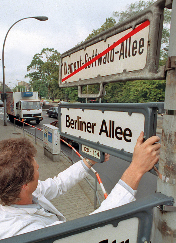 Laut Straßengesetz können die Bezirke Straßen und Plätze umbenennen, um Namen zu beseitigen, die an Gegner der Demokratie, an geistig-politische Wegbereiter und Verfechter der nationalsozialistischen und stalinistischen Gewaltherrschaften sowie des DDR-Regimes erinnern. Nach der Wiedervereinigung kam es in Ost-Berlin zu einer heftigen Umbenennungsdebatte. Die zahlreichen Straßen, die in der DDR nach SED-Parteigrößen und antifaschistischen Widerstandskämpfern benannt worden waren, kamen auf den Prüfstand. Von vielen Ost-Berlinern wurde das als Siegerjustiz und Denkmalstürmerei empfunden. Im zähen Ringen um die Deutungshoheit der Geschichte zogen sich Umbenennungsbeschlüsse über Jahre hin. Letztlich sind nicht nur eindeutige politische Größen ehemaliger Ost-Regime wie Lenin, Wilhelm Pieck, Otto Grotewohl, Georgi Dimitroff oder Klement Gottwald sowie Grenzsoldaten von den Straßenschildern getilgt worden, sondern auch die Frauenrechtlerin Clara Zetkin, die Politiker und Kämpfer im Spanischen Bürgerkrieg Hans Beimler und Artur Becker sowie der französische Politiker und Hauptorganisator des Pariser Aufstands von 1944, Jacques Duclos. Ihnen konnte man im Sinne des Straßengesetzes nur vorwerfen, dass sie Mitglied einer Kommunistischen Partei gewesen waren.