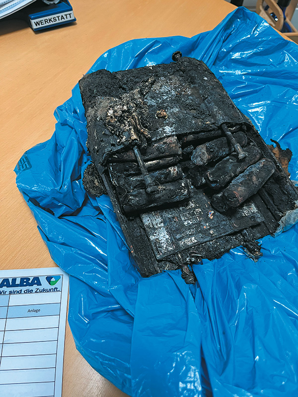 Die Mitarbeiter:innen auf dem ALBA-Hof hatten noch einmal Glück: Sie entdeckten den schon brennenden Akku eines E-Bikes gerade noch rechtzeitig in der Sortiermaschine, konnten ihn mit einem Bagger greifen und in eine bereitstehende Wassertonne werfen.