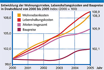 Auch das „ifs“ (Institut für Städtebau, Wohnungswirtschaft und Bausparwesen e.V.) in Berlin hat jetzt eine „Entspannung an den Mietwohnungsmärkten“ ausgemacht. Sicher, die Wohnungsmieten sind in den letzten beiden Jahren nur noch um jeweils 1 Prozent und damit geringer als die Lebenshaltungskosten (1,6 beziehungsweise 2 Prozent) gestiegen. Ohne die (kalten) Wohnnebenkosten lag der Mietenanstieg 2005 mit 0,9 Prozent sogar nur noch knapp halb so hoch wie die allgemeine Inflationsrate. Dr. Stefan Jokl, Leiter des Instituts, verweist allerdings darauf, dass es sich dabei um statistische Durchschnittswerte handelt. Denn erneut sind 2005 die Mieten für nach 1948 erbaute Wohnungen um 1,2 Prozent und die Wohnnebenkosten um 1,4 Prozent gestiegen. Wen tröstet es da schon, dass die Lebenshaltungskosten seit 2000 um 8,3 Prozent und die Wohnnebenkosten um 8,9 Prozent gestiegen sind, die Mieten dagegen „nur“ um 5,9 Prozent? Die Bruttolöhne und -gehälter sind 2005 im Vergleich zu 2004 gerade mal um 0,4 Prozent gestiegen. Da schlägt die vom ifs ermittelte durchschnittliche Quadratmetermiete von 6,10 Euro (West) beziehungsweise 5,30 Euro (Ost) stark zu Buche.