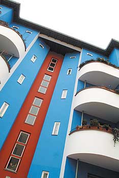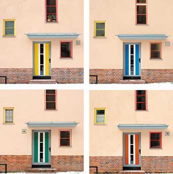 „Na, auch auf den Spuren von Taut?“, fragt eine Mieterin in der Heinz-Bartsch-Straße in Prenzlauer Berg einen jungen Mann, der sich die frisch sanierte Fassade ihres Hauses ansieht. Das zurückgesetzte Treppenhaus hebt sich in leuchtendem Blau und sattem Rot kräftig von der ansonsten weißen Fassade ab. Die langjährige Bewohnerin vermutet, einen Architekturstudenten vor sich zu haben. Seitdem die Wohnanlage denkmalgerecht wiederhergestellt ist, pilgern hier öfter ganze Seminargruppen samt Professor um den Block und bewundern die klaren Formen und die lebhaften Farben des 1927 von Bruno Taut gebauten Hauses. Der Mieterin gefällt die neu-alte Außenfassade auch, aber von den Farbkontrasten im Treppenhaus ist sie nicht so begeistert: „Wir müssen jetzt mit einer schwarzen Tür leben.“