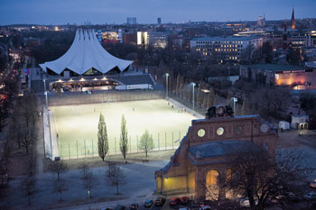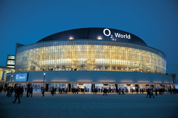 Die Grenze zwischen künstlich und künstlerisch zieht auch in Lichtfragen jeder anders: O2-Halle in Friedrichshain (oben), Illuminationen im Rahmen des „Festival of Lights“ (unten)