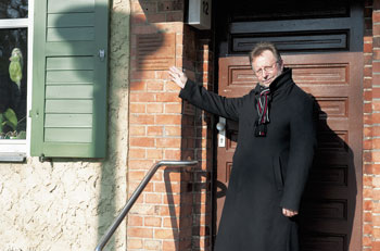 Die Wohnung, in der Heiner Müller lebte und arbeitete, ist heute vermietet. Aus den Fenstern zum Kissingenplatz kann man links die in norddeutscher Backsteingotik erbaute Pfarrkirche St. Georg, rechts das wuchtige Gebäude des „Rosa-Luxemburg-Gymnasiums“ sehen. Beide historischen Bauwerke ragen monströs aus den Häuserreihen heraus. So richtig passen sie nicht in das Ensemble der schlichten Wohnblöcke.