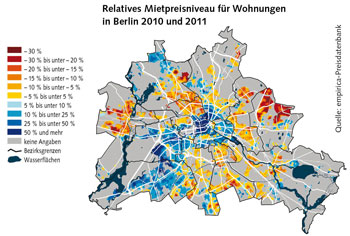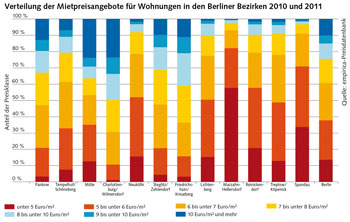 Im Mittel werden Mietwohnungen in Berlin zu einer Nettokaltmiete von 6,49 Euro pro Quadratmeter angeboten. Im Vorjahresbericht lag dieser Wert noch bei 6,17 Euro. Das entspricht einer Steigerung von 5,1 Prozent. Ausgewertet wurden dazu Wohnungsinserate aus dem Jahr 2010 und den ersten drei Quartalen von 2011.