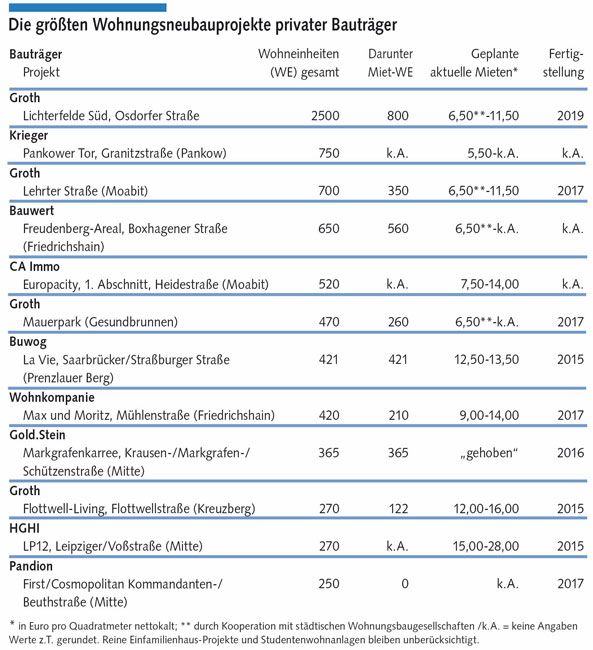 Wohnungsbau hat in Berlin wieder Konjunktur. Während die städtischen Wohnungsbaugesellschaften und die Genossenschaften bemüht sind, bezahlbare Mietwohnungen zu errichten, reiten private Bauträger weiter auf der Luxuswelle: Sie bauen überwiegend Eigentumswohnungen, vor allem im oberen Preissegment. Nur in wenigen größeren Bauprojekten sind auch preisreduzierte Mietwohnungen vorgesehen. Trotz ihrer intensiven Bautätigkeit ist der Beitrag privater Bauherren zur Entspannung des Wohnungsmarktes sehr gering.