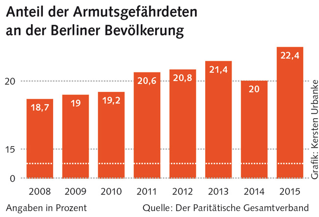 Eine Person gilt nach einer Definition des Bundesministeriums für Arbeit und Soziales als armutsgefährdet, wenn ihr Äquivalenzeinkommen die Armutsgefährdungsschwelle – 60 Prozent des mittleren Einkommens aller Nettoäquivalenzeinkommen – unterschreitet. Zum Nettoeinkommen zählen auch Wohngeld, Kindergeld und -zuschlag, andere Transferleistungen und sonstige Zuwendungen. Ein Single, der weniger als 917 Euro netto verdient, eine Alleinerziehende mit einem Kind unter sechs Jahren und einem Nettoverdienst von 1192 Euro und eine vierköpfige Familie, die zwischen 1978 und 2355 Euro netto im Monat zur Verfügung hat, gelten nach dieser Definition als arm. In Berlin stieg die Armutsquote von 19,7 im Jahre 2005 auf 22,4 Prozent im Jahre 2015. Die deutsche Hauptstadt gilt damit als „armutspolitische Problemregion“.