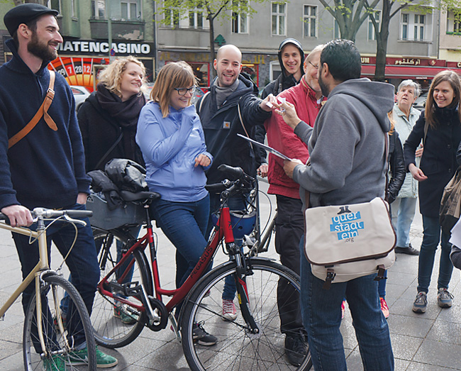 Die Route lenkt den Blick fort von Sehenswürdigkeiten, hin zu Schlafplätzen, Essensräumen und Versorgungseinrichtungen. Vor allem aber wird von Menschen und ihren besonderen Lebensgeschichten erzählt. Weil diese Stadtrundgänge so große Resonanz gefunden haben, bieten die Organisatoren seit dem vergangenen Jahr eine weitere besondere Tour: Flüchtlinge zeigen Neukölln. Die Tourguides führen zu jenen Orten, die für das Ankommen der Geflüchteten in der Stadt wichtig waren. Das kann ein Supermarkt sein oder der kleine arabische Imbiss, in dem es wie daheim schmeckt, ein Handy-Shop oder das Integrationsprojekt in der Nachbarschaft. Sie erzählen aber auch ihre eigene Geschichte: von Fluchtrouten, Wohnorten, alltäglichen Herausforderungen. Vorerst noch auf Englisch. Aber sie wollen auch sprachlich in Berlin ankommen – und dann auf Deutsch erzählen können.