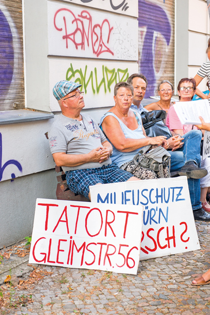 „Es bleibt einem gar nichts anderes übrig, als aktiv zu werden, vergleichbarer Wohnraum in der Stadt ist mittlerweile unbezahlbar für uns“, sagen auch die Mieter aus der Gleimstraße 56: „Entweder man macht richtig Rabatz oder man ist raus.“ Sie haben es mit einem wahren Protest-Marathon geschafft, das erste Vorkaufshaus in Pankow zu werden – und das trotz des exorbitant hohen Kaufpreises von 7,9 Millionen Euro. Pankows Baustadtrat Vollrad Kuhn (Bündnis 90/Die Grünen), der wesentlich zögerlicher bei der Ausübung des Vorkaufsrechts auftritt als sein Kollege in Friedrichshain-Kreuzberg, war zunächst nicht gerade Feuer und Flamme. „Es war ein ungeheurer Kraftakt“, seufzt Tanja Kapp vom Mieterverein „Gleim 56“. Man musste den Bezirk regelrecht beknien, sonst wäre gar nichts passiert. Zwei Monate lang wurden Flyer in der Nachbarschaft verteilt, Pressemitteilungen herausgegeben, selbst gekochte „politische Kampfmarmelade“ vor dem Abgeordnetenhaus verteilt und wöchentliche Protest-Spaziergänge organisiert. „Konsequent Gesicht zeigen“ sei genauso wichtig wie die Lobbyarbeit hinter den Kulissen, sagt Tanja Kapp. Damit die Bezirkspolitiker die Menschen, über deren Schicksal sie entscheiden, persönlich kennenlernen konnten, hat man sie ins Haus eingeladen. Über 70 Leute aus dem Bezirk und Vertreter des Abgeordnetenhauses kamen und plauderten beispielsweise mit der Rentnerin, die 1952 hier im Haus geboren worden war. Alle wussten: „Wenn wir nichts unternehmen, wird es mit Sicherheit nicht zu unseren Gunsten ausgehen.“ Bis zur großen Party muss die Gleimstraße 56 allerdings noch warten. Obwohl das Haus bereits von der Wohnungsbaugesellschaft Gesobau verwaltet wird, ist die Frist, innerhalb derer der Kaufinteressent Widerspruch einlegen kann, noch nicht abgelaufen.