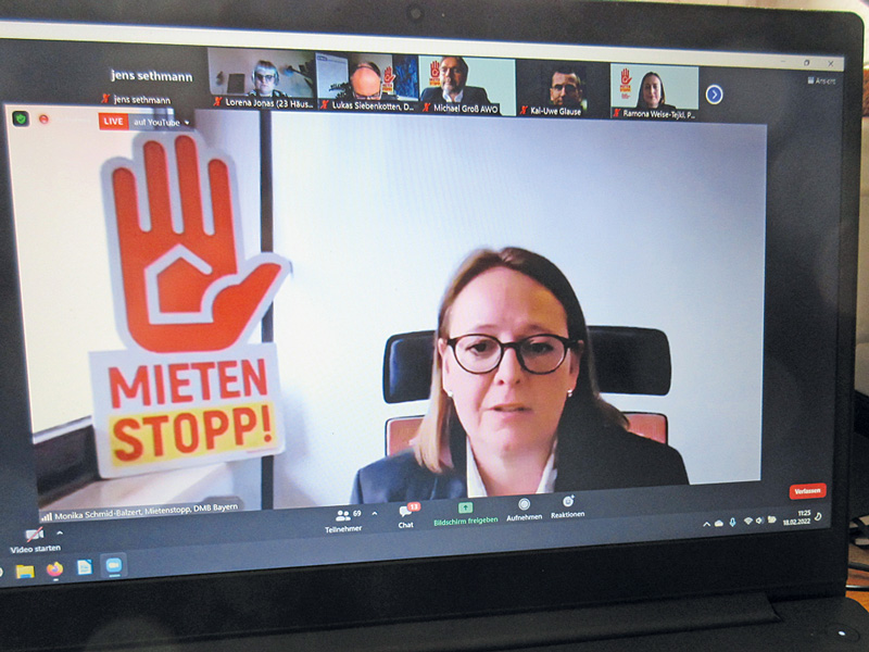 Gefordert wird von deren Mitgliedsorganisationen ein bundesweiter Mietenstopp für sechs Jahre. Nachdem die Verfassungsgerichte den Ländern Berlin und Bayern die Zuständigkeit für ein entsprechendes Vorgehen abgesprochen haben, ist nun der Bund am Zug. „Ein Mietenstopp würde den Menschen unmittelbar und schnell helfen“, sagt Monika Schmid-Balzert, Geschäftsführerin des Mieterbundes Bayern und Sprecherin der Kampagne Mietenstopp. Die Kampagne fordert, dass in Orten mit entspanntem Wohnungsmarkt die Mieterhöhungsmöglichkeiten auf zehn Prozent in drei Jahren begrenzt werden und in Städten mit angespannter Lage auf sechs Prozent. In Städten mit besonders angespanntem Wohnungsmarkt sieht das Konzept ein Einfrieren der Mieten für sechs Jahre vor.