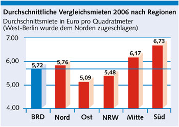 Zu Grunde gelegt wurde eine 65 Quadratmeter große Wohnung mit mittlerer Ausstattung, bei normalem Instandhaltungsgrad, in mittlerer Wohnlage und differenziert nach Baualtersklassen. Die aktuelle Durchschnittsmiete über alle Baualtersklassen beträgt bundesweit für diese Wohnung 5,72 Euro pro Quadratmeter nettokalt. Überdurchschnittlich ist das Mietniveau in den Wachstumsregionen mit prosperierender Wirtschaft. Mit 54 Prozent über dem Bundesdurchschnitt ist München weiterhin die teuerste Wohnstadt Deutschlands. Bei den Großstädten folgen Düsseldorf (30 Prozent über dem Durchschnitt), Stuttgart (29 Prozent), Köln (27 Prozent), Wiesbaden (26 Prozent) und Frankfurt/Main (20 Prozent). Deutlich überdurchschnittliche Mieten gibt es auch in zahlreichen Speckgürtel-Orten rund um die teuren Großstädte. So ist zum Beispiel das Mietniveau in Norderstedt höher als in Hamburg. Der Westteil Berlins hat nach dieser Analyse ein um 3 Prozent unterdurchschnittliches Mietniveau und liegt damit im Ranking bundesweit auf Platz 81. Im Ostteil Berlins liegen die Mieten um 11 Prozent unter dem Schnitt, das ist Platz 150 des bundesweiten Rankings und Platz 17 im Vergleich der Ost-Kommunen. Das vergleichsweise günstige Mietniveau in Berlin resultiert vor allem aus den Altbaumieten. Die stiegen zwar laut Berliner Mietspiegel 2005 deutlich an, liegen aber immer noch erheblich unter Hamburger oder Münchner Niveau. Anders bei den Neubaumieten. Bei 1985 bezugsfertig gewordenen Wohnhäusern liegen die Berliner Mieten im Spitzenbereich. Ein Vergleich der Mieten sagt jedoch nichts über die unterschiedliche Mietbelastung der Bewohner aus. „Wir gehen davon aus, dass in Berlin wegen insgesamt eher niedrigerer Einkommen nur ein unwesentlich kleinerer Teil des Einkommens für die Wohnkosten ausgegeben werden muss als zum Beispiel in Stuttgart oder Düsseldorf“, erläutert Reiner Wild vom Berliner Mieterverein.