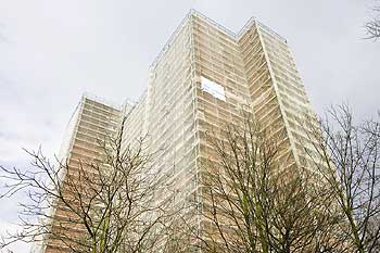 Presslufthämmer dröhnen hinter den Bauplanen des Hochhauses Schulze-Boysen-Straße 35-37. Die 18 und 21 Stockwerke hohen Türme des Plattenbaus sind komplett eingerüstet. Anfang März rückten Bauarbeiter als Erstes der Fassade des Doppelwohnhochhauses zu Leibe. Schließlich ist die Dämmung der Plattenbau-Außenhaut eines der Hauptprojekte innerhalb der neun Monate andauernden Komplettsanierung. Bis Dezember dieses Jahres sollen außerdem die zugigen alten Fenster durch Isolierfenster mit Dreifachglas ersetzt, Decken und Wände im Innenbereich wärmegedämmt und die komplette Heiztechnik erneuert werden. Künftig wird ein neuer Fernwärmeanschluss mit einem modernen Blockheizkraftwerk kombiniert und eine moderne Zu- und Abluftanlage mit Wärmerückgewinnung installiert. Die Zuluft soll in sämtliche Wohnräume der 296 Wohnungen geleitet und in den Bädern sowie Küchen wieder abgesaugt werden. Eine Wärmerückgewinnungsanlage stellt dem Gebäude anschließend die in der Abluft enthaltene Wärme wieder zur Verfügung.