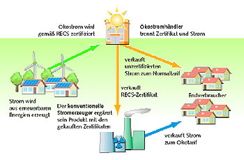 Manche regionale Stromanbieter würden herkömmlichen Strom aus Atom- oder Kohlekraftwerken als „Ökostrom“ verkaufen, so der Vorwurf. Im Zentrum der Kritik steht das sogenannte „Renewable Energy Certificate System“ (RECS). Zu diesem Zertifizierungssystem haben sich 173 Mitglieder aus fünfzehn europäischen Ländern zusammengeschlossen: Stromversorger, aber auch Umweltorganisationen. Mit ihm soll sichergestellt werden, dass die vom Kunden bestellte Ökostrommenge auch tatsächlich der Menge entspricht, die aus erneuerbaren Energiequellen hergestellt worden ist. Ein umweltfreundlicher Energieerzeuger, beispielsweise ein Wasserkraftwerk aus Skandinavien, kann sich beim RECS-System registrieren lassen. Von da an erhält er für jede erzeugte Megawattstunde Strom ein RECS-Zertifikat, das in der Datenbank des Systems abrufbar ist und dem Strommarkt zur Verfügung steht. Ein Stromhändler in Deutschland hat nun die Möglichkeit, die Menge an RECS-Zertifikaten zu kaufen, die dem Verbrauch des von ihm belieferten Ökostrom-Kunden entspricht. Das heißt: Der Stromhändler liefert seinem Kunden zwar weiterhin Atom- oder Kohlestrom, darf diesen nun aber offiziell als „Ökostrom“ bezeichnen. Das Wasserkraftwerk wiederum muss nach dem Verkauf der Zertifikate die gleiche Menge seines ökologisch erzeugten Stroms als „konventionell“ umetikettieren. Als „reinen Verschiebebahnhof“ bezeichnete Dr. Torsten Kasper vom Verbraucherzentrale Bundesverband diese Praxis.