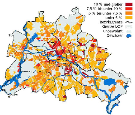 Die räumliche Verteilung der Leerstände hat sich in den letzten fünf Jahren jedoch von den östlichen Stadtrandgebieten Stück für Stück in die westlichen Innenstadtgebiete verschoben. Im Jahr 2003 wies noch der Bezirk Marzahn-Hellersdorf mit 8,3 Prozent die höchste Leerstandsquote auf. Bis heute konnte hier der Leerstand – vor allem durch den Abriss tausender Wohnungen – auf 6,3 Prozent reduziert werden. Seit drei Jahren hat hingegen der Bezirk Mitte mit aktuell 8 Prozent die höchste Quote, gefolgt von Neukölln mit 6,7 Prozent und steigender Tendenz. Die Bezirke mit dem geringsten längerfristigen Leerstand sind Reinickendorf mit 4,4 Prozent und Lichtenberg mit 4,5 Prozent.