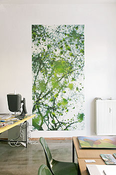 Radomski spricht gerne von der „vierten Wand“ eines Raums, die sich gut mit Tapete mache. Doch längst werden nicht mehr gleich ganze Wände tapeziert, geschweige denn ganze Räume. „Unsere Tapeten werden heute mehr wie Bilder eingesetzt, sie setzen Akzente“, sagt Simone Schulz. Die Architektin hat 2004 zusammen mit dem Künstler André Kazenwadel in Kreuzberg die „Dr. Nice GbR“ gegründet. „Manchmal reicht schon eine einzelne Tapetenbahn, um die richtige Atmosphäre zu schaffen.“ Klassiker sind zum Beispiel Fototapeten mit Obst, Gemüse oder Espressotassen hinterm Küchentisch. „Hinterm Bett wollen viele unserer Kunden ein Nebelmeer“, sagt Simone Schulz. „Ansonsten sind interessanterweise häufig Motive gefragt, die die Leute ohnehin vor der Tür haben: Berliner wollen den Fernsehturm, Norddeutsche den Strand, Bayern die Berge“, erzählt André Kazenwadel. Dr. Nice stellt nicht nur Foto- und Mustertapeten her, sondern bringt auch Literaturkollagen der bekannten Autorin Herta Müller auf Tapete.