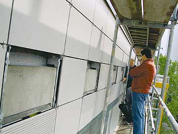 Alle 17 in Berlin heimischen Fledermausarten sind streng geschützt, ihre Schlafplätze dürfen nicht verändert werden. Auch der Ablauf von Bauarbeiten muss sich nach den Tieren richten, im Winterhalbjahr darf nicht gebaut werden. Doch die Wohnungsbaugenossenschaft Amtsfeld ging weit über diese gesetzlichen Verpflichtungen hinaus. Unter fachlicher Anleitung des Naturschutzbundes Deutschland (NABU) wurden in einem aufwändigen Verfahren speziell gefertigte Schlitze in die neue Fassade eingepasst. „Nach anfänglichen Irritationen wurde die neue Einschlupfmöglichkeit von den Tieren sehr gut angenommen“, freut sich Karsten Kallasch, der das Projekt begleitet hat.